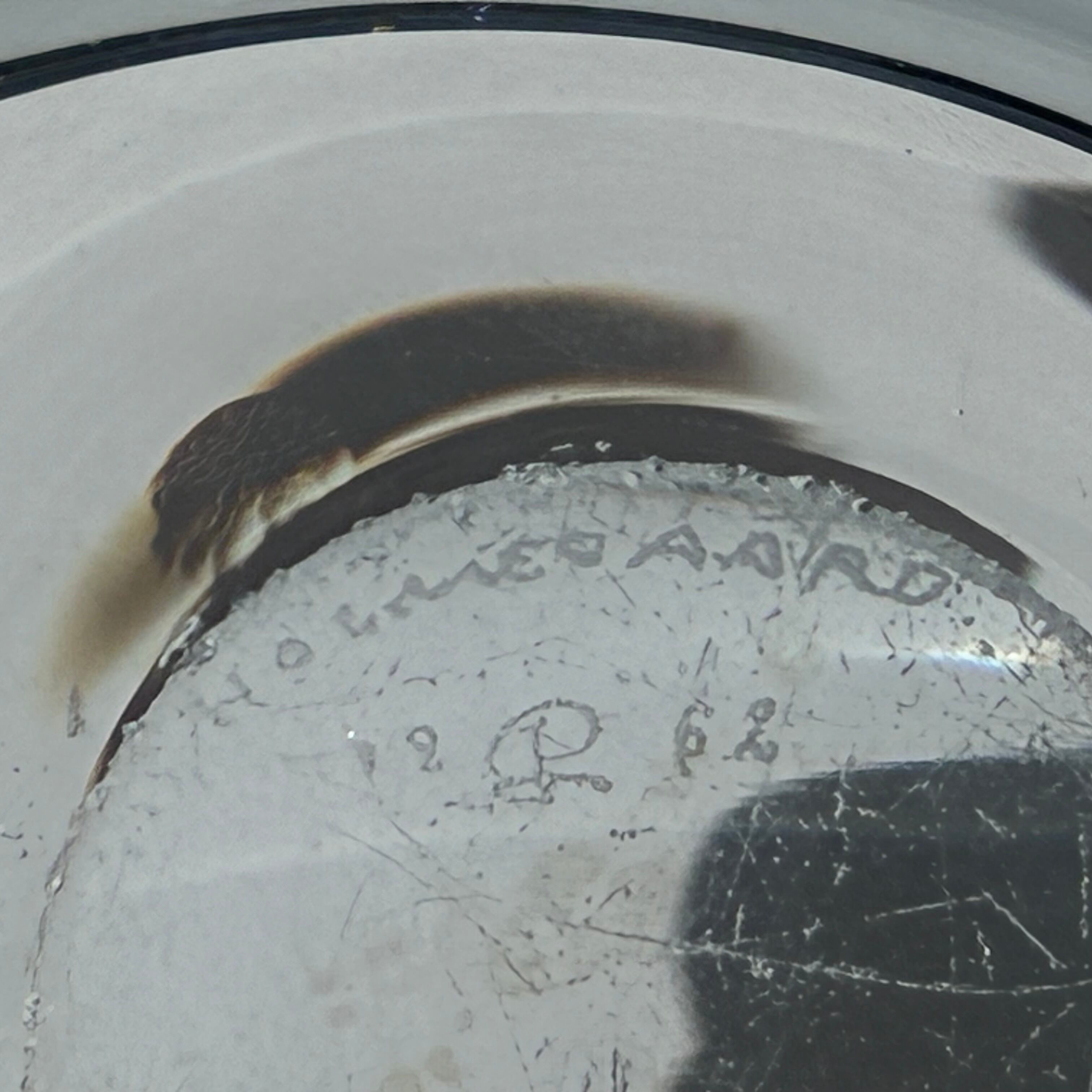 長い年月が経過しておりますので、全体的に小傷や目立つ傷が数箇所ございます。裏面に着色汚れや擦れた跡、極小のカケがございますが、灰皿としての使用は感じられず、全体的にはまずまずの保存状態です。